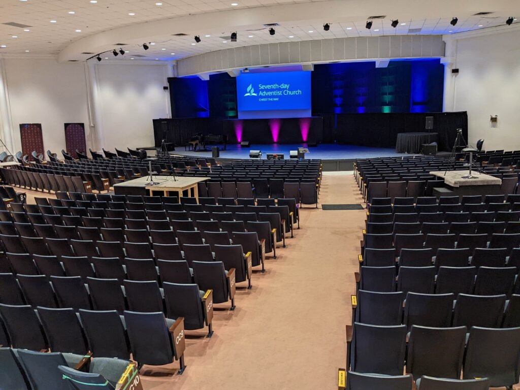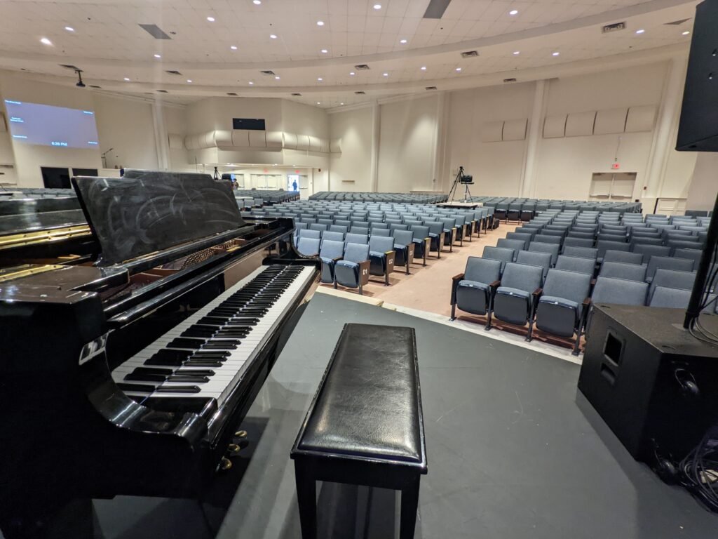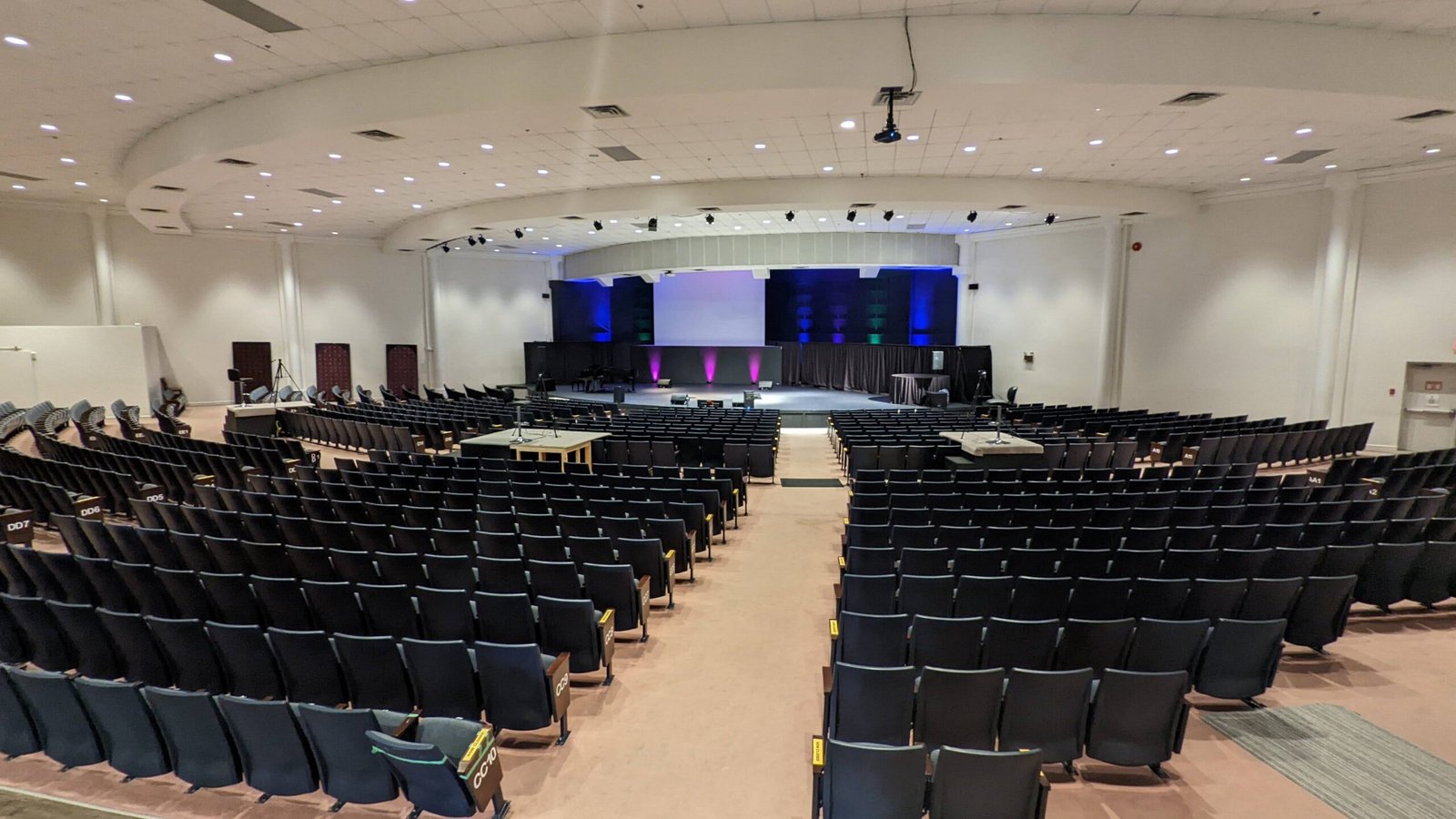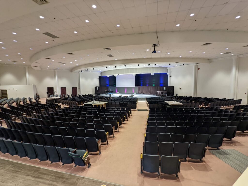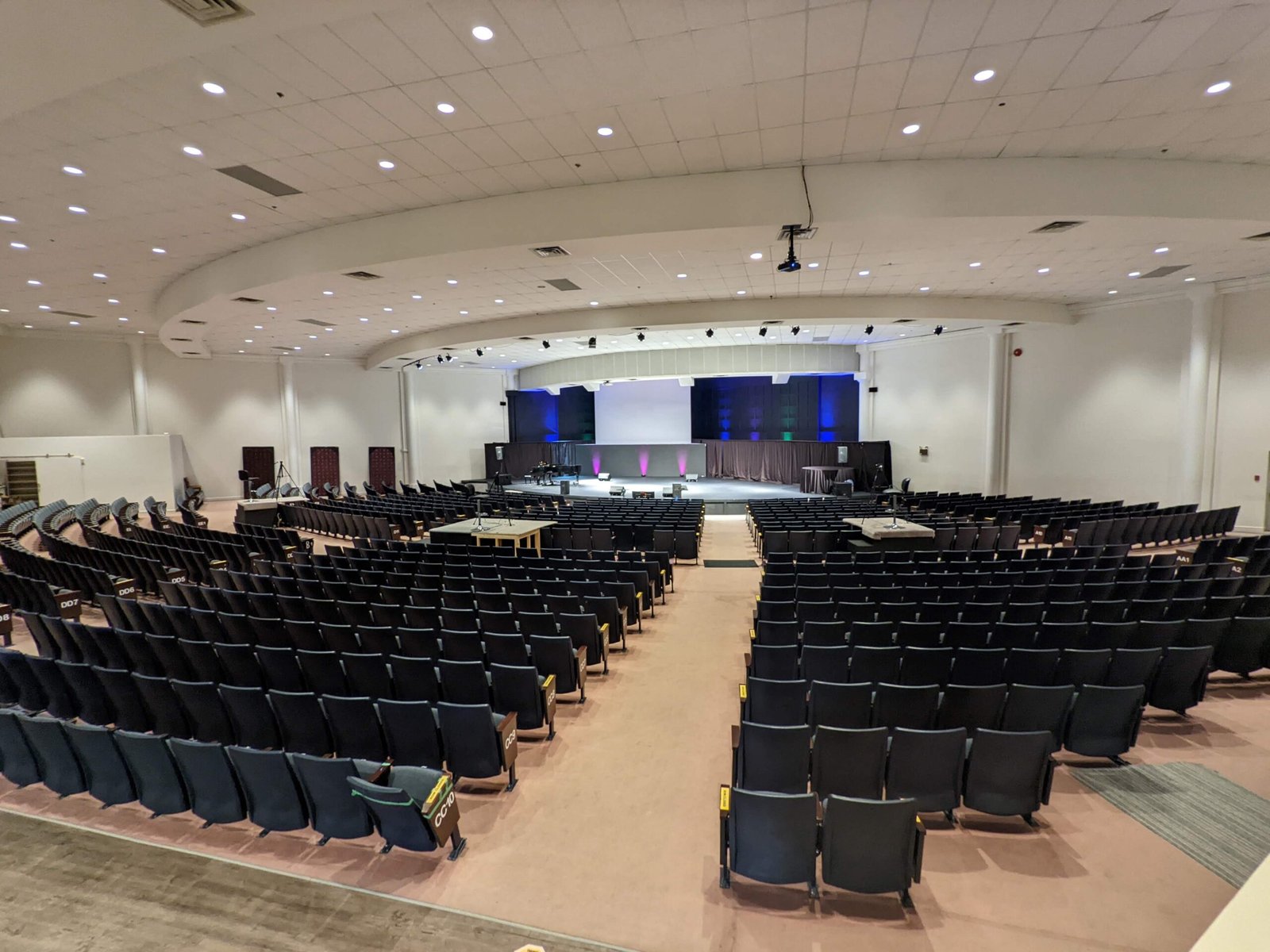Our spacious auditorium seats up to 1,105 guests, making it ideal for conferences, concerts, worship services, and large community gatherings. The venue is equipped with an in-house audio and lighting system, including four microphones and stage monitors to support presentations and performances. Please note that lighting and video operators are not included with the rental and may need to be arranged separately.
